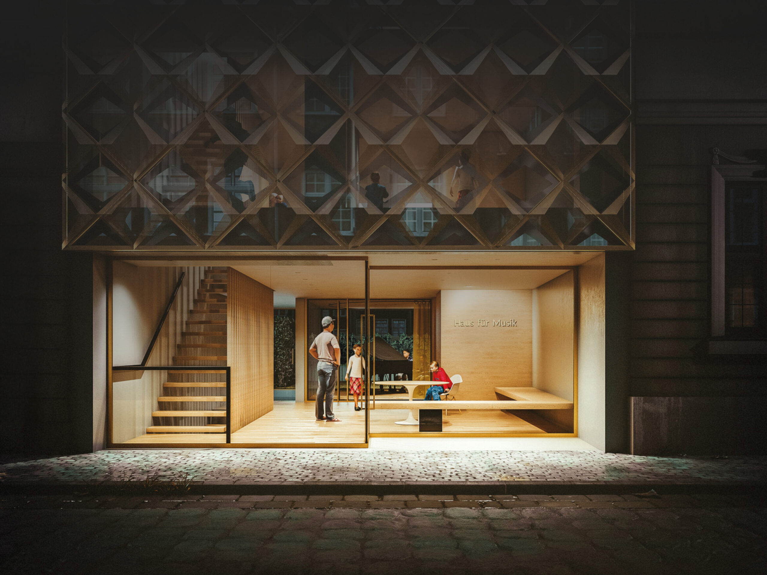 Das Ergebnis ist eine ganzheitliche Architektur mit individuell ausgestatteten Proberäumen, worin nicht nur Klang transportiert, sondern dieses auch fühlbar gemacht wird – ein Haus, in dem Musikerinnen und Musiker ihre Kreativität entfalten können, ohne durch äußere Einflüsse gestört zu werden.