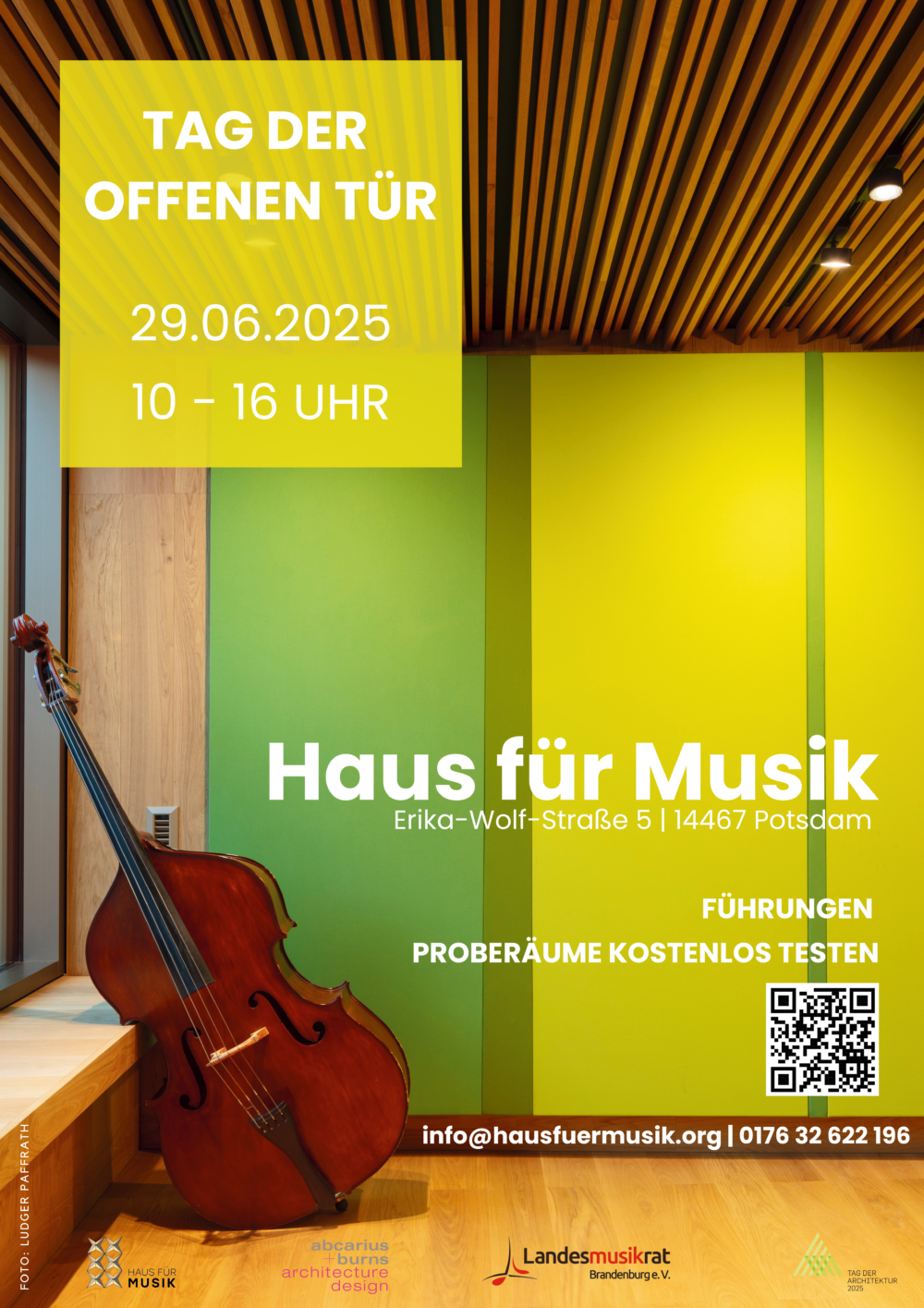 Am Sonntag, den 29. Juni 2025, öffnet das Haus für Musik Potsdam im Rahmen des Tag der Architektur erstmals seine Türen für die Öffentlichkeit. Zwischen 10:00 und 16:00 Uhr können Besucher’innen das neu errichtete Gebäude mitten in der Potsdamer Innenstadt entdecken – mit Führungen, Musik, Austausch und der Gelegenheit, die hochwertigen Proberäume selbst auszuprobieren.